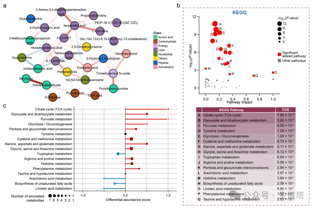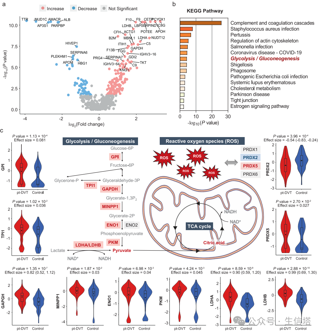 通过对pt-DVT患者和对照组的血浆样本进行蛋白质组学分析,鉴定出214种差异表达的蛋白质,并发现与糖酵解/糖异生-TCA循环相关的多个蛋白质在pt-DVT患者中显著上调,暗示这一代谢途径可能与疾病的发展有关。图5 代谢组学和蛋白质组学分析揭示了pt-DVT的潜在治疗策略综上所述,研究者们使用机器组学代谢组学和蛋白质组学分析buff叠满,表明,糖酵解/糖异生- TCA循环的上调可能通过调节红细胞中的ROS水平来促进血栓形成,总之,本研究全面描述了pt-DVT的代谢和血液学失调,并为早期检测提供了潜在的生物标志物。小伙伴们,在学习完这篇文章,有没有多组学研究套路更了解一点呢,再也不用担心发不出优质文章了!省时省力还能发高分文章,谁能不爱呢?现在,就是最好的时光,学习大佬们的思路,学会多组学套路,你不发高分文章谁发?小小期刊,随时拿下!!如果你任何问题或者实验思路困扰,随时滴滴小塔,小塔为你服务哦~ 生信塔公众号持续为大家带来最新生信思路,更多创新性分析思路请点击往期推荐,快来查看吧!想复现这种思路或者定制更多创新性思路欢迎直接call小塔,我们团队竭诚为您的科研助力!