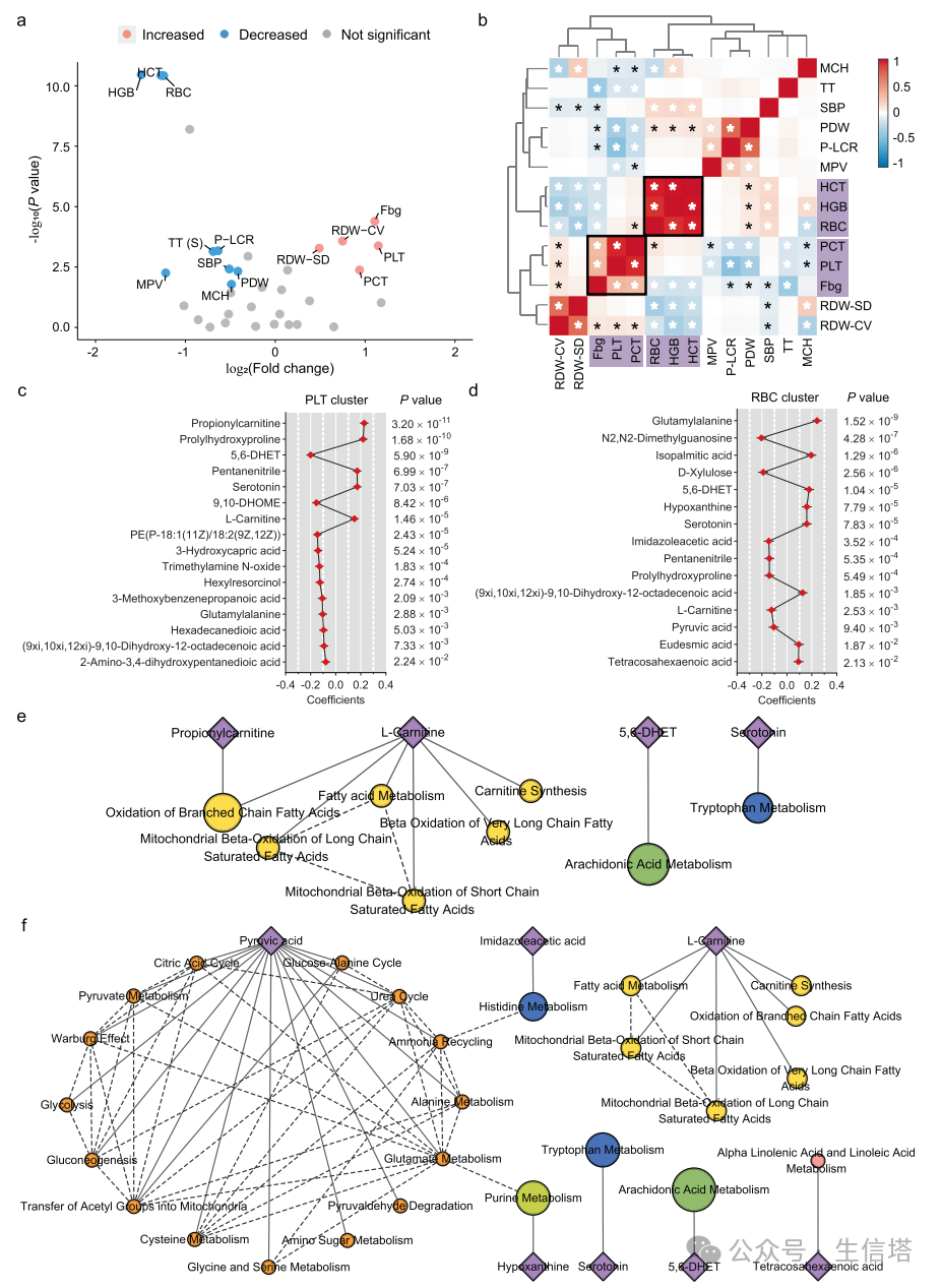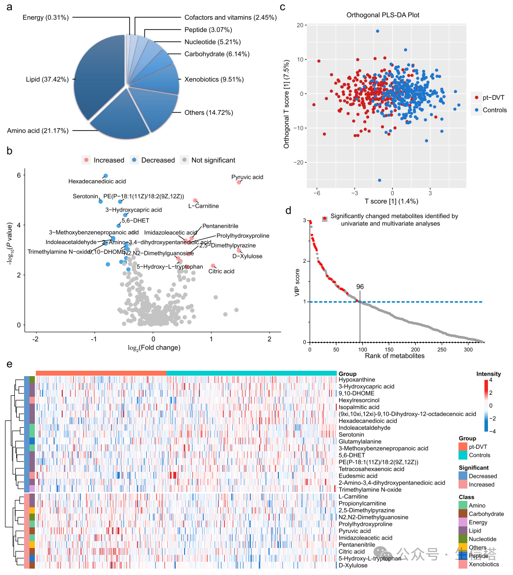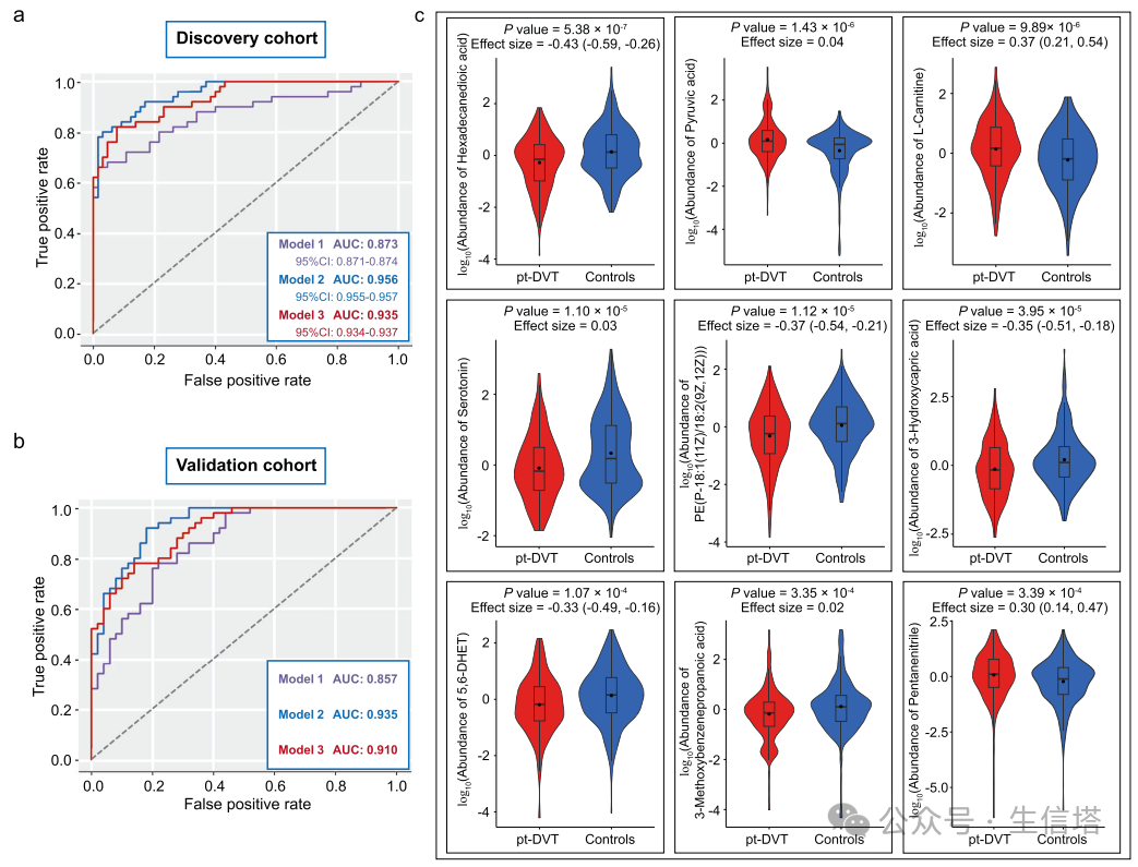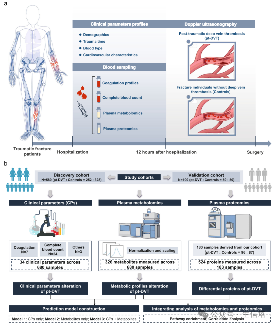 目前,创伤后深静脉血栓形成(pt-DVT)的诊断依赖于D-二聚体的实验室测量和超声成像特征。尽管D-二聚体在住院成人患者中已被验证为风险工具,但在手术或创伤后患者中的应用尚不清楚。从创伤后的患者中收集血浆样本,通过整合血浆代谢组学和蛋白质组学的数据,来评估创伤后深静脉血栓(pt-DVT)患者的代谢变化及其潜在功能。 通过LC-MS鉴定和数据筛选,确定了326种在所有样本批次中稳定可检测的代谢物,并根据京都基因与基因组百科全书(KEGG)的代谢途径被分为8个功能类别和一个未知类别。通过主成分分析(PCA),研究者评估了代谢分析的全局变异性和数据质量,其中第一和第二主成分(PC1和PC2)分别解释了数据集总方差的8.6%和4.7%。通过单变量和多变量分析,包括火山图OPLS-DA,确定了28种显著改变的代谢物,这些代谢物涉及脂质、氨基酸、碳水化合物等多个代谢途径,并利用去偏稀疏偏相关(DSPC)网络揭示了代谢物间的密集相互作用,特别是脂质和氨基酸代谢之间的联系。确定了14个显著改变的临床参数(CPs),其中5个在DVT患者中增加,其余减少,并通过Pearson相关分析发现这些CPs倾向于根据功能相似性聚类,如纤维蛋白原、血小板红细胞比容和血小板计数形成的增加簇,以及红细胞计数、红细胞比容百分比和血红蛋白浓度形成的减少簇。这些发现揭示了pt-DVT的两个典型临床特征,即血小板相关参数的增加(PLT簇)和红细胞相关参数的减少(RBC簇),其中血小板和血小板红细胞比容显示出对pt-DVT的高度特异性,表明它们可能是临床诊断的有前景的生物标志物。对独立验证队列的100名参与者进行了代谢组学分析,并评估了包含显著改变的临床参数和代谢物的预测模型,发现模型2和模型3在预测pt-DVT方面表现出色。 进一步的模型缩减和特征选择后,包含9种代谢物的模型2在发现和验证队列中均显示出最佳的预测性能,表明血浆代谢物是早期诊断和预测pt-DVT的有力候选生物标志物。5、代谢组学和蛋白质组学分析揭示了pt-DVT的潜在治疗策略