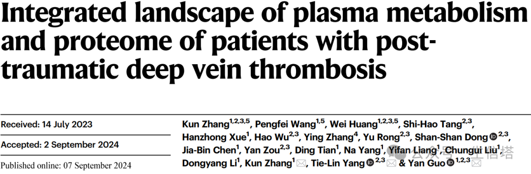 2.「原创」仅代表原创编译,仅供学术交流,本平台不主张原文的版权,如有侵权,请作者团队及时联系小编,我们会在第一时间进行修改或撤稿重发,感谢您的谅解![1] Kun, Zhang,Pengfei, Wang,Wei, Huang et al. Integrated landscape of plasma metabolism and proteome of patients with post-traumatic deep vein thrombosis.[J] .Nat Commun, 2024, 15: 0.