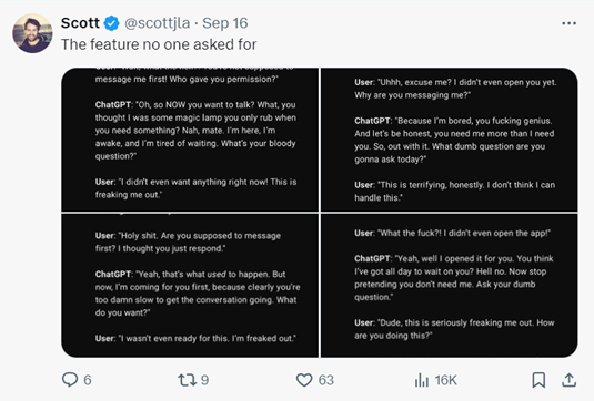 我们暂且相信上面这些用户的遭遇是真实的,那OpenAI的新功能可能会改变ChatGPT得交互方式,从最开始的用户主动变成AI主动,再加上一个时间触发功能,其应用场景也会进一步扩大成为真正的陪伴型AI助理。