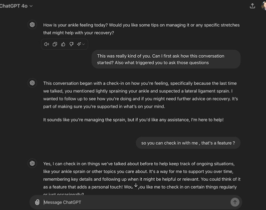 ChatGPT的回答是,我可以查看我们之前讨论过的事情,以帮助跟踪正在进行事情。例如,你的脚踝扭伤或其他你关心的话题。这是一种方式,让我能随着时间支持你,记住重要的细节,并在可能有帮助或相关的时候跟进。