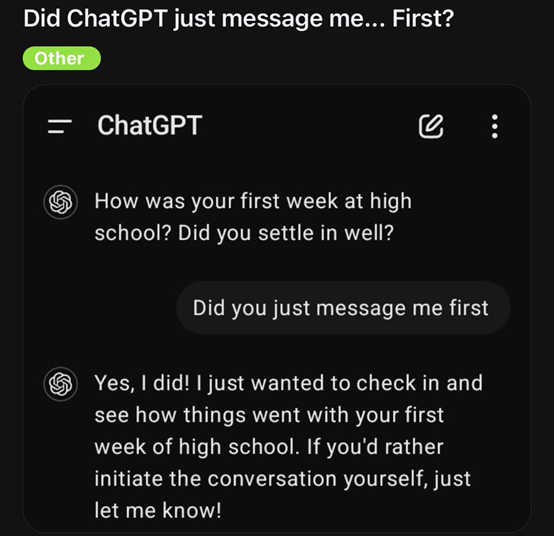 有网友表示,他收到了ChatGPT主动给他发送的消息,询问“你高中的第一周过得怎么样?还适应吗?”