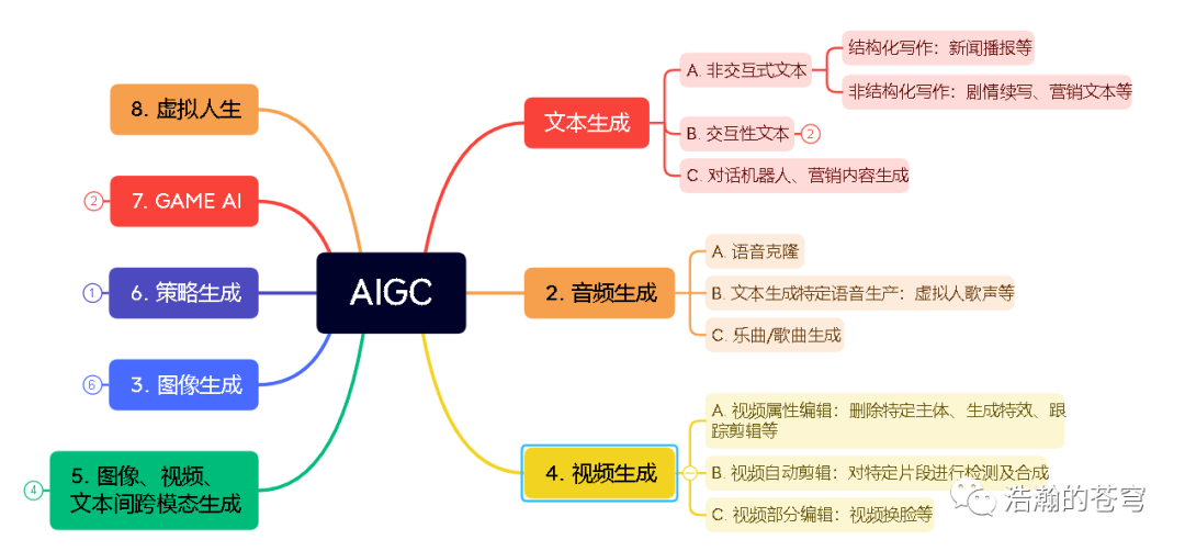 AIGC 包括:文本生成、音频生成、视频生成 等 约 10 个大类(详见下图)。