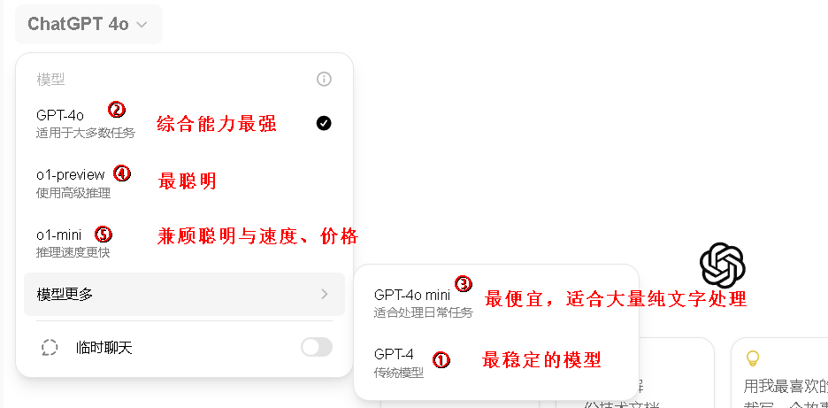 ③GPT4o-mini:GPT4o的阉割版,速度非常快,也非常便宜,取代了gpt3.5,适合大量文字分析,开发人员首选。