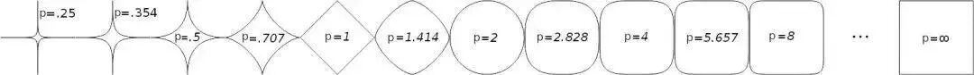 范数简单可以理解为用来表征向量空间中的距离,而距离的定义很抽象,只要满足非负、自反、三角不等式就可以称之为距离。p的范围是[1,∞)。p在(0,1)范围内定义的并不是范数,因为违反了三角不等式。根据pp的变化,范数也有着不同的变化,借用一个经典的有关P范数的变化图如下: