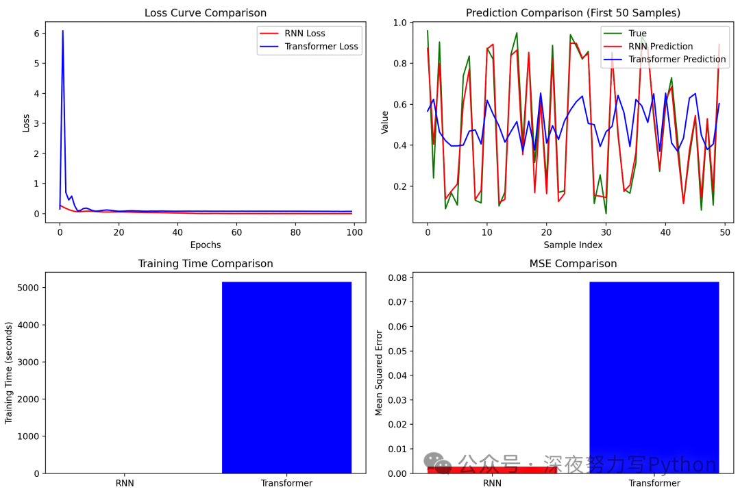 4. 预测误差 :在MSE比较中,Transformer明显优于RNN,表明Transformer在该任务中具有更好的准确性。