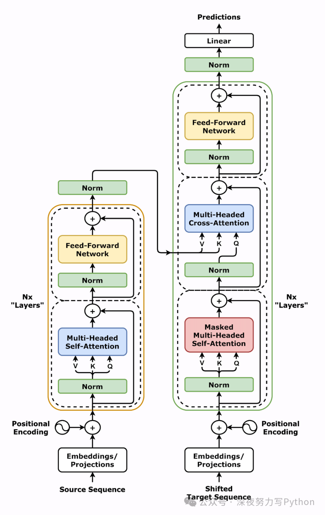梯度消失/爆炸问题 :当序列较长时,梯度容易消失或爆炸,导致模型训练困难,尤其在处理长期依赖时表现不佳。并行化困难 :由于序列数据是按时间步递归处理的,无法并行训练,导致效率较低。适用场景 短期依赖的时序数据建模任务,如时间序列预测、简单的序列分类任务。 较短文本的自然语言处理任务,如词性标注、简单的文本生成等。 Transformer 原理 Transformer 是一种专为序列建模和并行计算设计的神经网络,它抛弃了RNN的递归结构,完全依赖于自注意力机制(Self-Attention)来建模序列数据中的依赖关系。通过自注意力,Transformer能够对整个序列的所有位置进行全局的依赖建模,适用于处理长序列任务。
