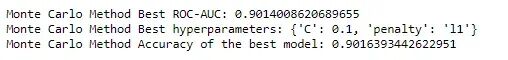 from sklearn.model_selection import GridSearchCV hyperparameters = {'C' : [0.001 , 0.01 , 0.1 , 1 , 10 , 100 , 1000 ], 'penalty' : ['l1' , 'l2' ]} grid_search = GridSearchCV(LogisticRegression(), hyperparameters, cv=5 , scoring='roc_auc' ) grid_search.fit(X_train, y_train) best_params = grid_search.best_params_ print(f'Best hyperparameters: {best_params} ' ) best_model = grid_search.best_estimator_ y_pred_best = best_model.predict(X_test) accuracy_best = accuracy_score(y_test, y_pred_best) roc_auc_best = roc_auc_score(y_test, y_pred_best) print("Grid Search Method " + f'Accuracy of the best model: {accuracy_best} ' ) print("Grid Search Method " + f'ROC-AUC of the best model: {roc_auc_best} ' )使用蒙特卡洛方法进行超参数调优 最后应用蒙特卡洛方法进行超参数调优: