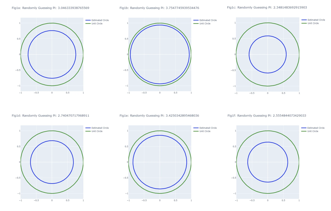 {chr(97 + i)} : Randomly Guessing Pi: {pi_guess} " , width=600 , height=600 , xaxis=dict( constrain="domain" , range=[-1 , 1 ] ), yaxis=dict( scaleanchor="x" , scaleratio=1 , range=[-1 , 1 ] ) ) # 显示图形 fig.show()这段代码生成了一系列图形(图1a到图1f),展示了随机猜测π值的结果。每次猜测都会生成一个不同大小的圆,与实际的单位圆(绿色)进行比较。