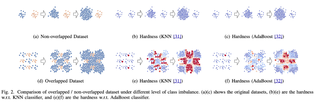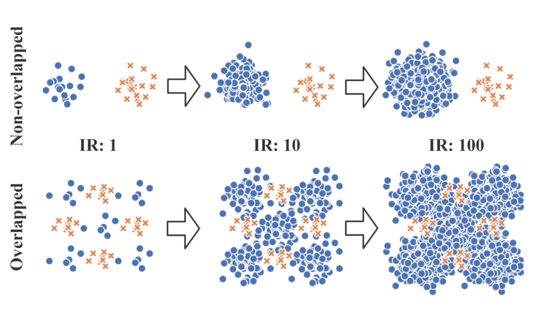 ▲ 从左到右:类别比例(imbalance ratio/IR)逐渐增长。第一行:一个线性可分的简单任务。第二行:一个相对困难的复杂任务。
