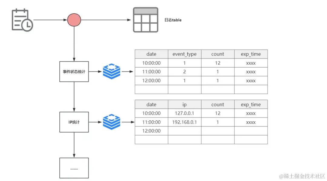经过短暂的思考后,决定以归档的方式进行数据处理,即在存储日志前,先对日志数据进行分门别类的处理,比如需要统计每个时段的事件访问量,那么就以小时和事件状态为标识进行存储,假设在12:30分有一条异常的访问,那么在消费端接收到消息后,先查询数据库中是否存在12点且访问异常的数据,如果存在,那么次数加一,否则将该数据插入到数据库中,这样在一小时内统一时间状态只会存在一条数据。