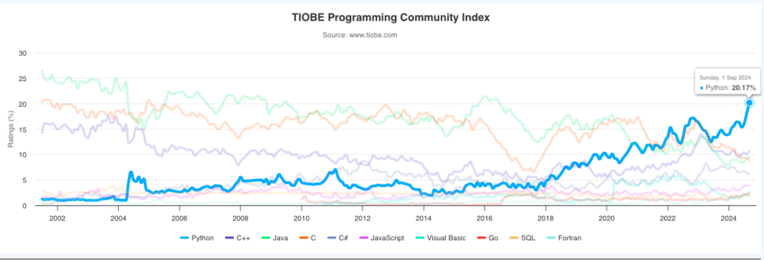 从长远来看,自 2018 年起,Python 语言的发展势头就逐渐强劲,呈现出指数级的增长。可以说,人工智能的兴起是推动这一趋势的关键因素。