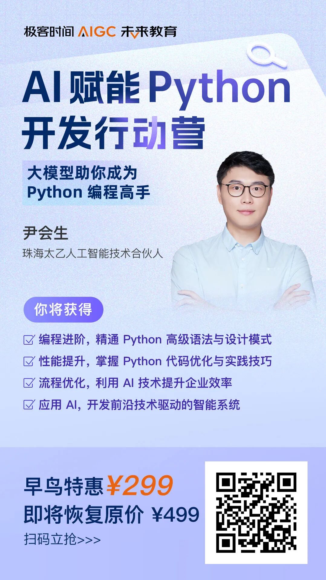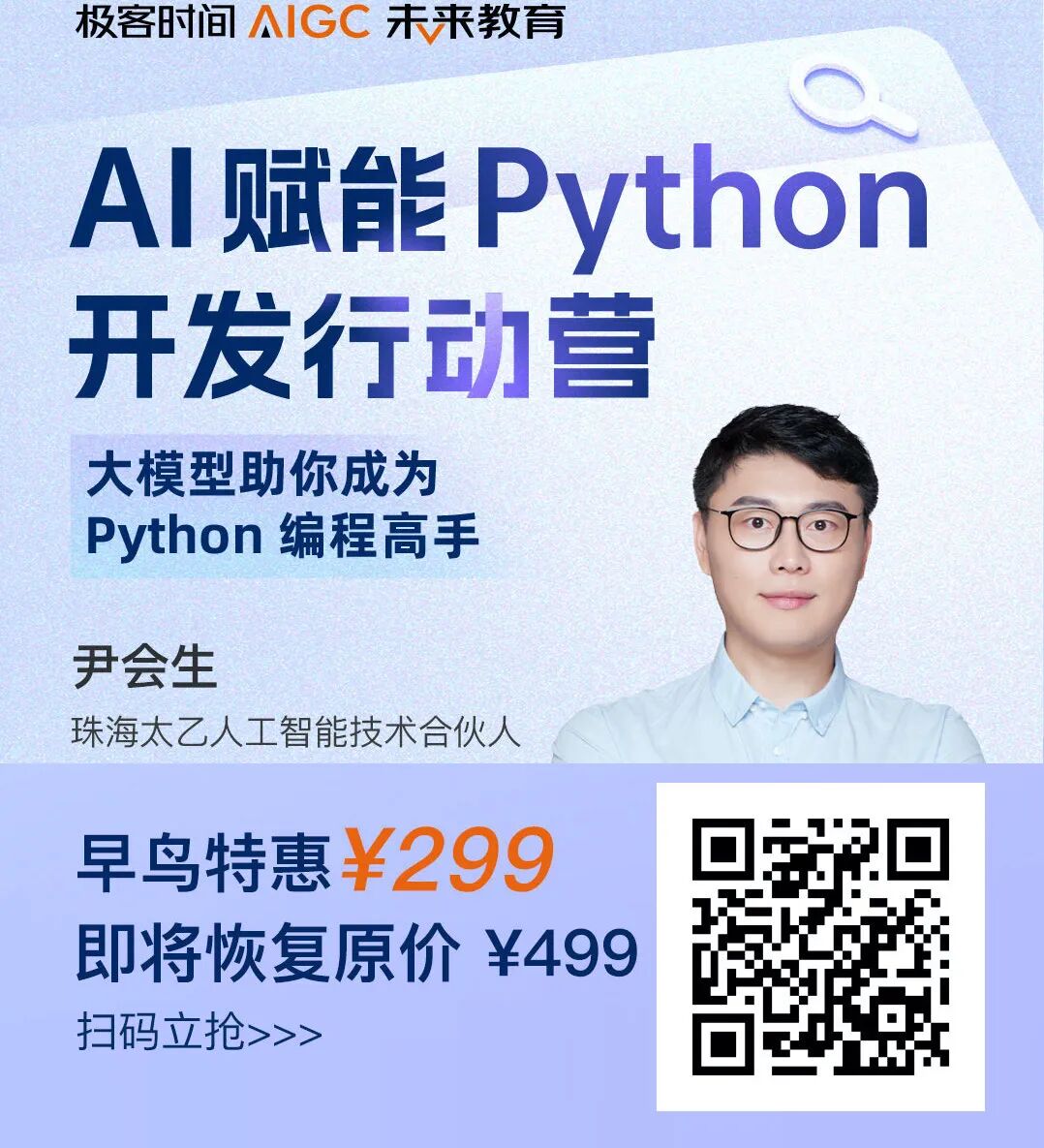 立即加入《 AI 赋能 Python 开发行动营》,跟随资深 AI 专家尹会生老师,打破编程障碍,巧妙运用 AI 提高 Python 技能吧。