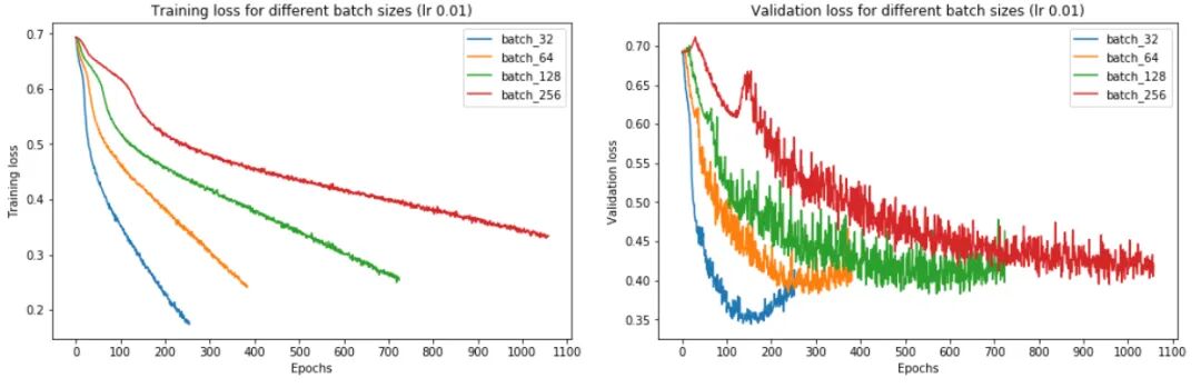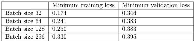 其次,大批量训练比小批量训练实现更糟糕的最小验证损失。例如,批量大小为 256 的最小验证损失为 0.395,而批量大小为 32 时为 0.344。