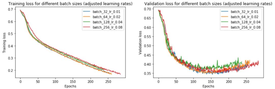 不同批次大小的训练和验证损失,调整学习率 批量大小的最小训练和验证损失 事实上,我们发现调整学习率确实消除了小批量和大批量之间的大部分性能差距 。现在,批量大小 256 的验证损失为 0.352 而不是 0.395——更接近批量大小 32 的损失 0.345。