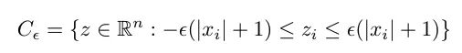 最大化损失的约束框。 其中 epsilon 是定义邻域大小的参数,x 是最小值(权重)。