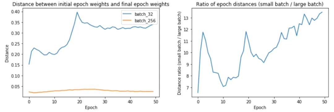 左图:按批次大小划分的epoch距离。右:epoch距离的比率。 上面的第一幅图显示,较大的批次大小确实确实在每个 epoch 中遍历的距离更短。第 32 批训练的 epoch 距离从 0.15 到 0.4 不等,而第 256 批训练的距离约为 0.02–0.04。事实上,正如我们在第二个图中所看到的,epoch距离的比率随着时间的推移而增加!