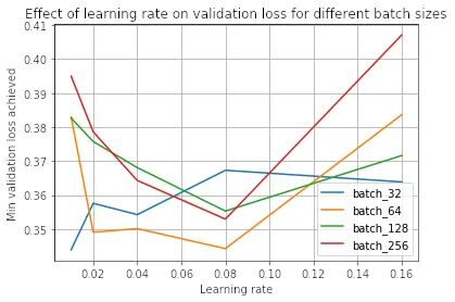 我们看到,0.01 的学习率对于批大小 32 是最好的,而 0.08 对于其他批大小是最好的。