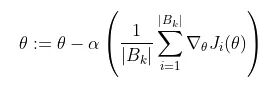 B_k 是从训练数据集中采样的一批,其大小可以从 1 到 m(训练数据点的总数)。这通常称为批量大小为 |B_k| 的小批量训练。我们可以将这些批次级梯度视为“true”梯度的近似值,即整体损失函数相对于 theta 的梯度。我们使用小批量是因为它倾向于更快地收敛,因为它不需要完全遍历训练数据来更新权重。