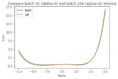 在第一个中,我们沿着小批量minimizers(批量大小 32)和大批量minimizers(批量大小 256)之间的线绘制训练和验证损失。这条线由以下等式描述: