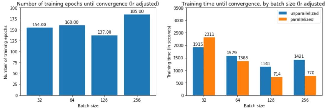 提高学习率如何影响训练时间?由于大批量训练现在可以在与小批量训练大致相同的迭代次数中收敛,如图 25 中的左图所示,现在总体训练时间更短——批量大小 256 为 2197 秒,而批量为 3156 大小为 32。如果我们跨 4 个 GPU 并行化,则加速更加明显。
