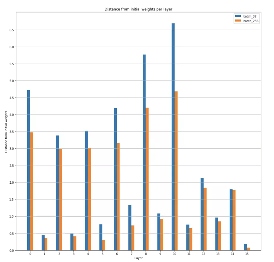 调整前后按批次大小与初始权重的距离 大多数情况下,答案是肯定的。如果我们看上面的图,调整学习率有助于缩小批量大小 32 与其他批量大小之间在与初始权重的距离方面的差距。(请注意,128 似乎是一个异常,其中增加学习率会降低距离——为什么会出现这种情况,有待未来调查。)