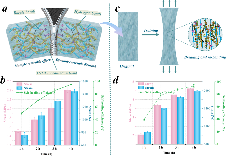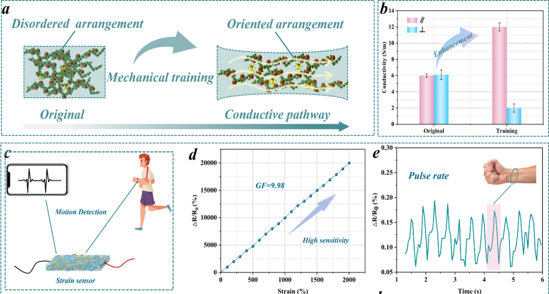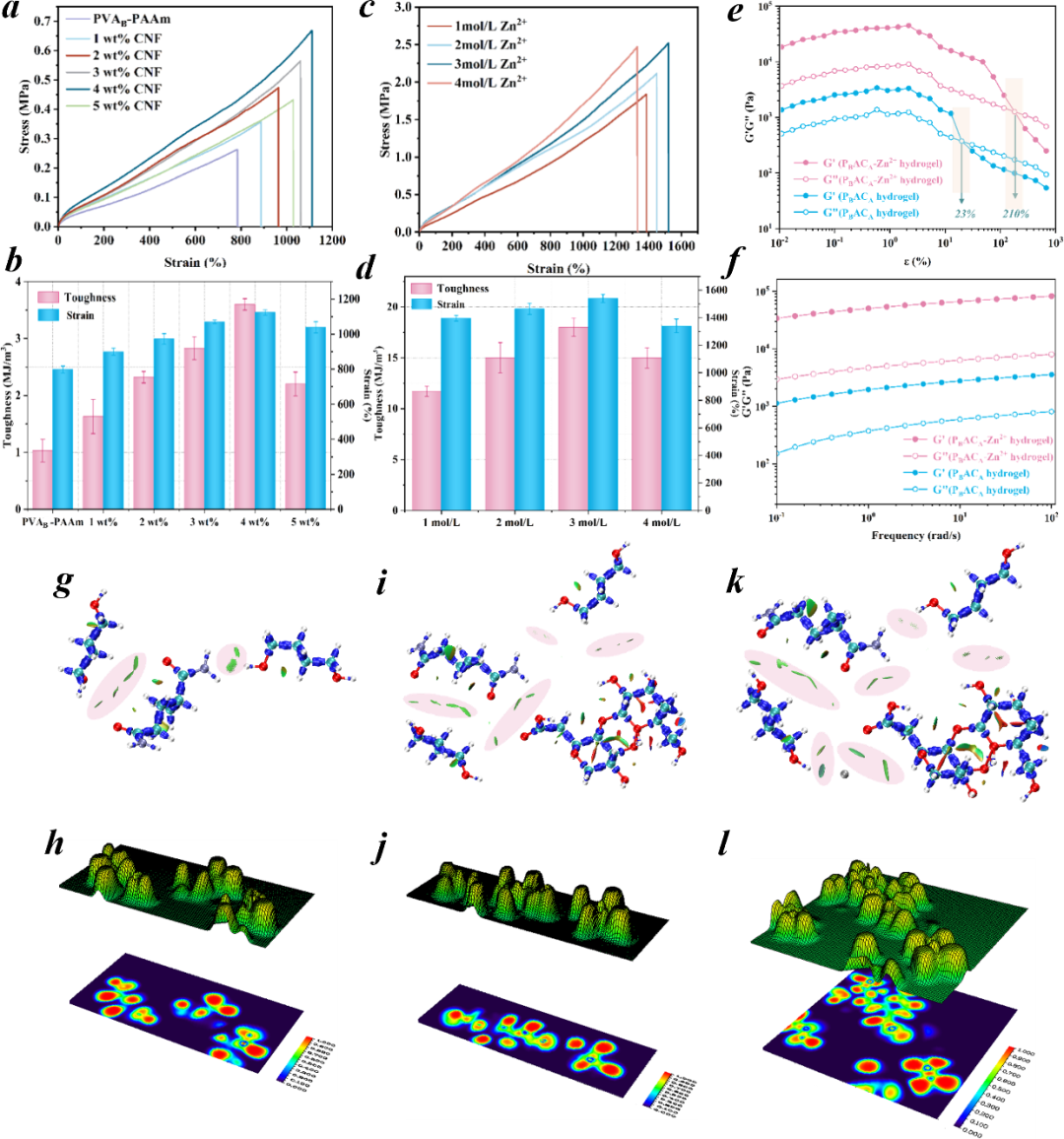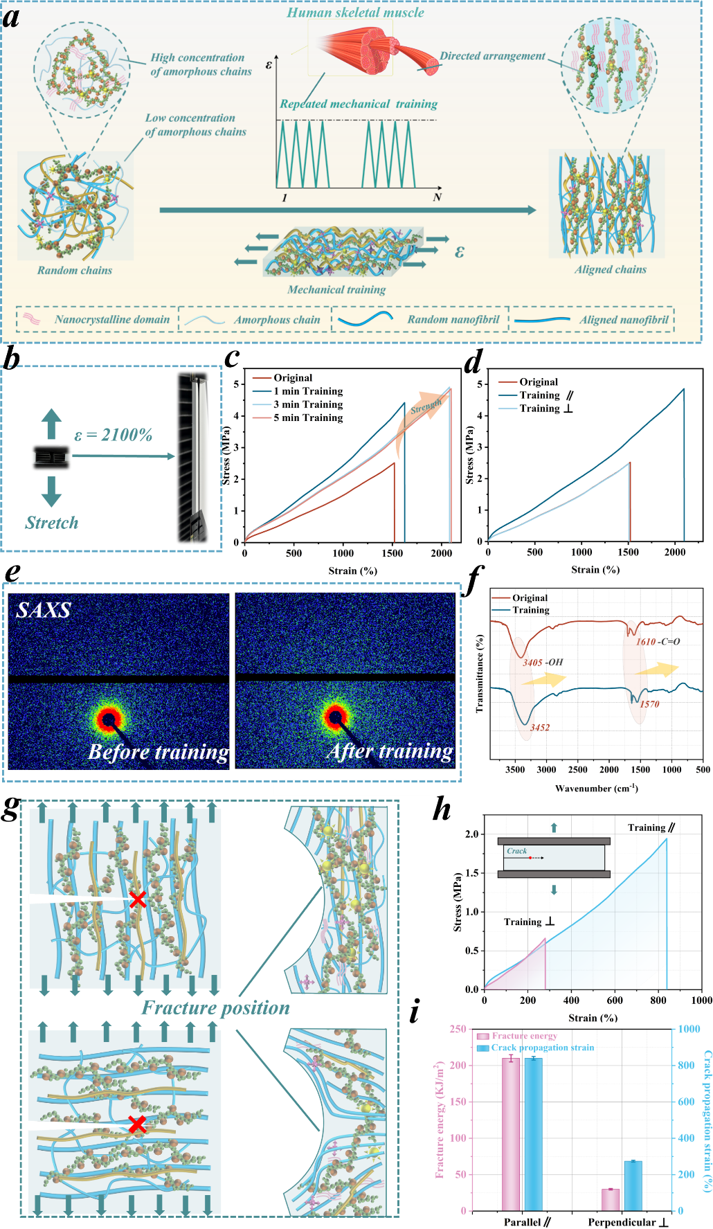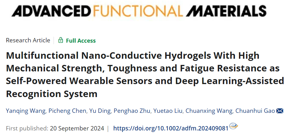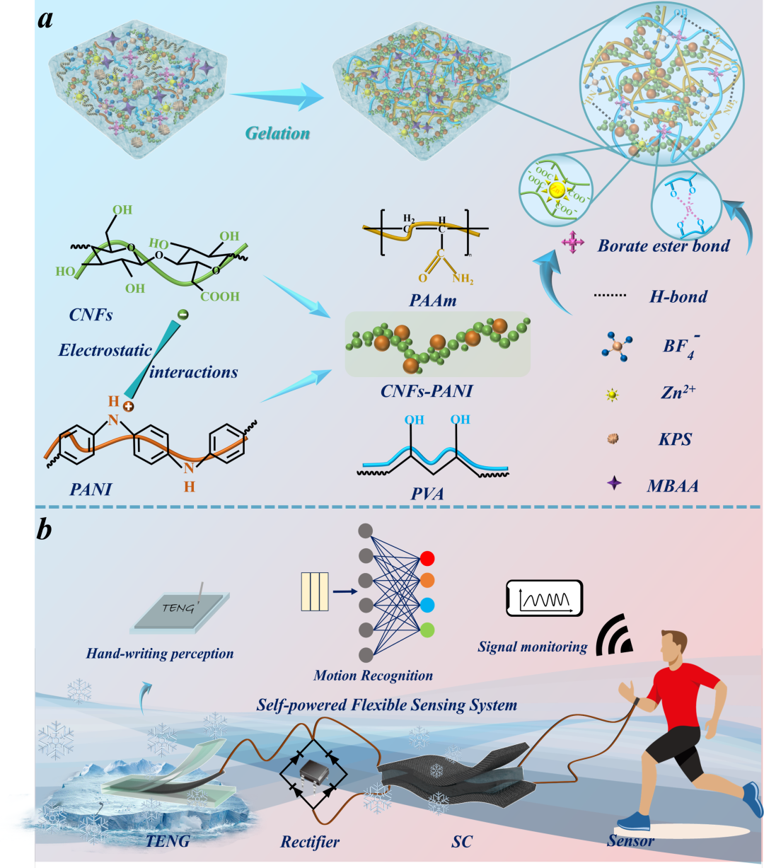 高机械强度、坚韧和抗疲劳性对于提升导电水凝胶在自供电传感系统中的可靠性至关重要。然而,要同时实现这些互斥的性能仍然具有挑战性。近日,青岛科技大学高传慧教授团队提出了一种基于拓扑网络结构和力学训练的新型定向互锁策略,通过优化网络结构和调节分子链取向,成功构建出一种具有优异机械性能的多功能导电水凝胶。由聚乙烯醇(PVA)、聚丙烯酰胺(PAAm)和纤维素纳米纤维(CNFs)构成的独特三重互锁网络不仅确保了结构的稳定性,同时通过机械训练使分子链定向排列,大幅提升了水凝胶的机械强度和韧性。纳米晶域的形成和重新取向过程使得材料在应对裂纹扩展时表现出卓越的抗疲劳性能。独特的网络设计有效保证了机械训练过程中材料性能的持续增益效果。本研究首先设计了一种具有三重网络结构的互锁水凝胶,系统探讨了不同纤维素纳米纤维(CNFs)含量及金属离子浓度对材料机械性能的影响。由于CNFs具有较大的纵横比以及分子链间的缠结,过量添加CNFs会导致团聚体的形成,从而引起水凝胶中应力分布的不均匀性,导致机械强度的下降。因此,本研究选定含量为4 wt%的CNFs水凝胶用于后续研究。通过引入增强的金属交联系统,成功构建了三重网络互锁结构,并采用动态流变测试验证了水凝胶的稳定性。所制备的三网络水凝胶的最大拉伸强度可达2.52 MPa,应变达到1520.4%。图3机械训练策略下PBACA-Zn2+水凝胶力学性能。为了进一步提升导电水凝胶的韧性和抗疲劳性,研究中引入了一种机械训练方法,以实现水凝胶中纳米纤维的定向排列结构。图3形象地展示了骨骼肌仿生水凝胶的训练策略。从中可以观察到,原本在PBACA-Zn²⁺水凝胶中随机取向的纳米晶域经过训练后被重新定向排列。同时,PVA链段与CNFs链段之间通过氢键重新构筑的互锁结构有效阻碍了链段的移动,从而实现了PBACA-Zn²⁺水凝胶在强度和韧性上的同步提升,其最大拉伸强度达到4.98 MPa,韧性高达48 MJ·m-3。此外,互锁网络中的链段在滑移后紧密排列,形成定向的纳米晶域排列,显著提高了水凝胶的结晶度。通过这些对齐排列的纳米晶域,水凝胶能够有效传递和分散应力集中,显著提升其抗疲劳性。图4 PBACA-Zn2+水凝胶的自修复特性和防冻保湿特性。此外,为了拓展导电水凝胶的应用领域,研究人员引入了多重可逆相互作用机制,使材料具备自修复能力,从而显著提升其耐用性。同时,由于氟原子具有较强的电负性,其打破了冰晶间的原有结构,赋予材料优异的防冻性能,极大地增强了其环境适应性。锚定在纤维素纳米纤维上的聚苯胺通过在训练过程中构建导电纤维形成独特的导电通路,极大提高导电性能,确保自供电设备具有强大的输出性能。该导电凝胶已成功应用于自供电传感系统,并开发了深度学习辅助运动识别系统,显示出可靠的实际应用价值。总的来说,研究团队通过定向互锁策略成功制备了一种具有优异机械强度、韧性和抗疲劳性能的导电水凝胶。值得强调的是,定向导电通路的构筑显著增强了水凝胶的导电性能,从而提高了自供电器件的输出效率。得益于多重可逆效应,受损的水凝胶能够实现快速而高效的自我修复;同时,氟原子与水分子之间的强相互作用赋予了水凝胶优异的抗冻特性。当前所开发的自供电系统已展示出广泛的实际应用潜力,这为多功能水凝胶材料提供了新的应用前景。该工作以“Multifunctional Nano-Conductive Hydrogels With High Mechanical Strength, Toughness and Fatigue Resistance as Self-Powered Wearable Sensors and Deep Learning-Assisted Recognition System”为题发表在《Advanced Functional Materials》上。青岛科技大学化工学院高传慧教授为论文通讯作者,第一作者为化工学院博士研究生王彦庆。该研究得到国家自然科学基金、山东省泰山产业创新领军人才和山东省高等学校青创团队计划等项目的支持。