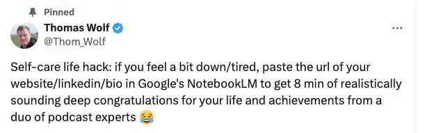 NotebookLM 播客生成功能似乎触及了一个全新领域,也就是极具吸引力的大语言模型交付形式。这种感觉让人有种 ChatGPT 刚亮相时的惊艳,也许是我反应过度,但这真的令人印象深刻。
