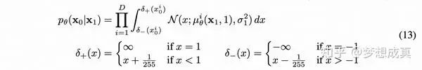 ,简单提一下。在反向过程结束时,回想一下我们正在尝试生成一个由整数像素值组成的图像 。因此,我们必须设计一种方法来获取所有像素上每个可能像素值的离散(对数)似然。 详细的推导就不介绍了。