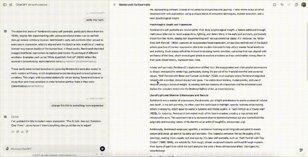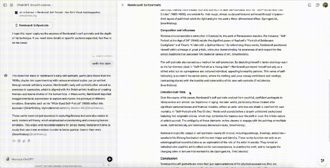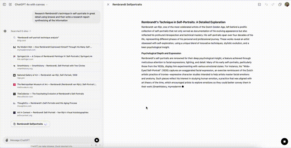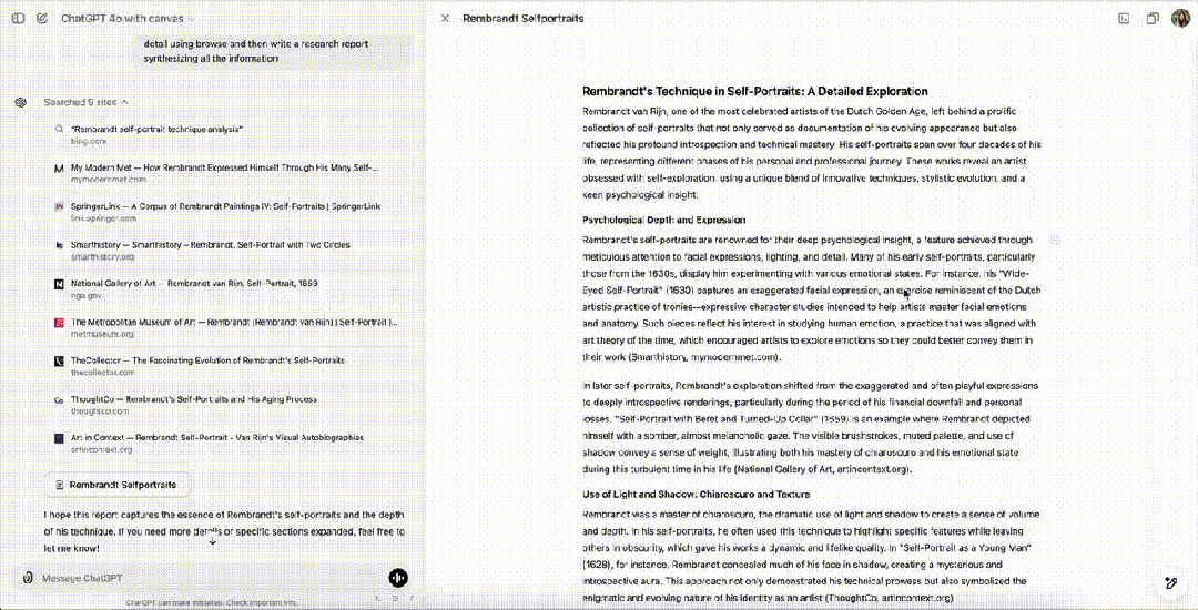 首先,将你的需求告诉ChatGPT,它便开始搜索一切所有相关的报道——Rembrandt的自画像技巧。