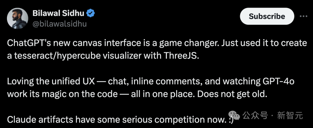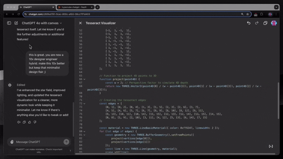 他刚刚通过canvas和ThreeJS一起创建了一个tesseract/Hypercube可视化工具,并称自己喜欢统一的UX聊天、在线评论和观看GPT-4o在代码上发挥其魔力,所有这些都在一个地方完成完成,永不过时。