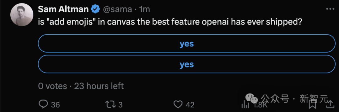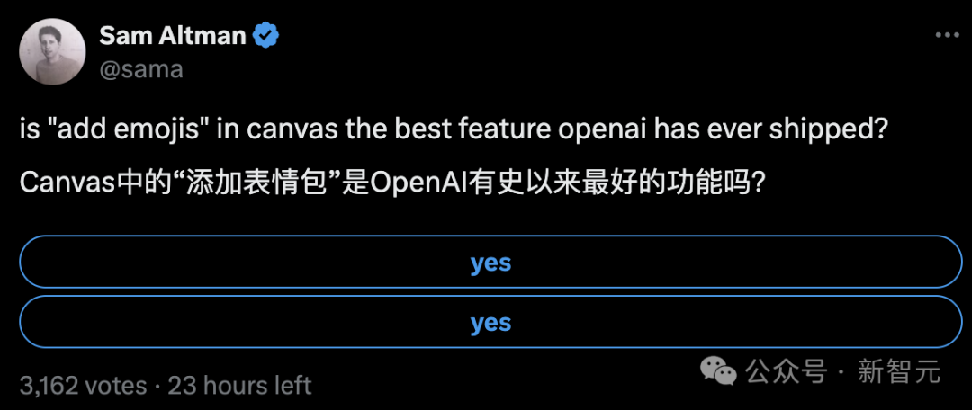奥特曼还发起了在线投票,「添加emoji是不是OpenAI有史以来发布的最好功能?」