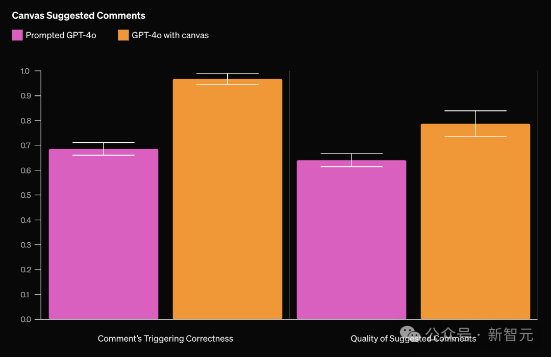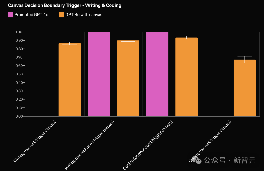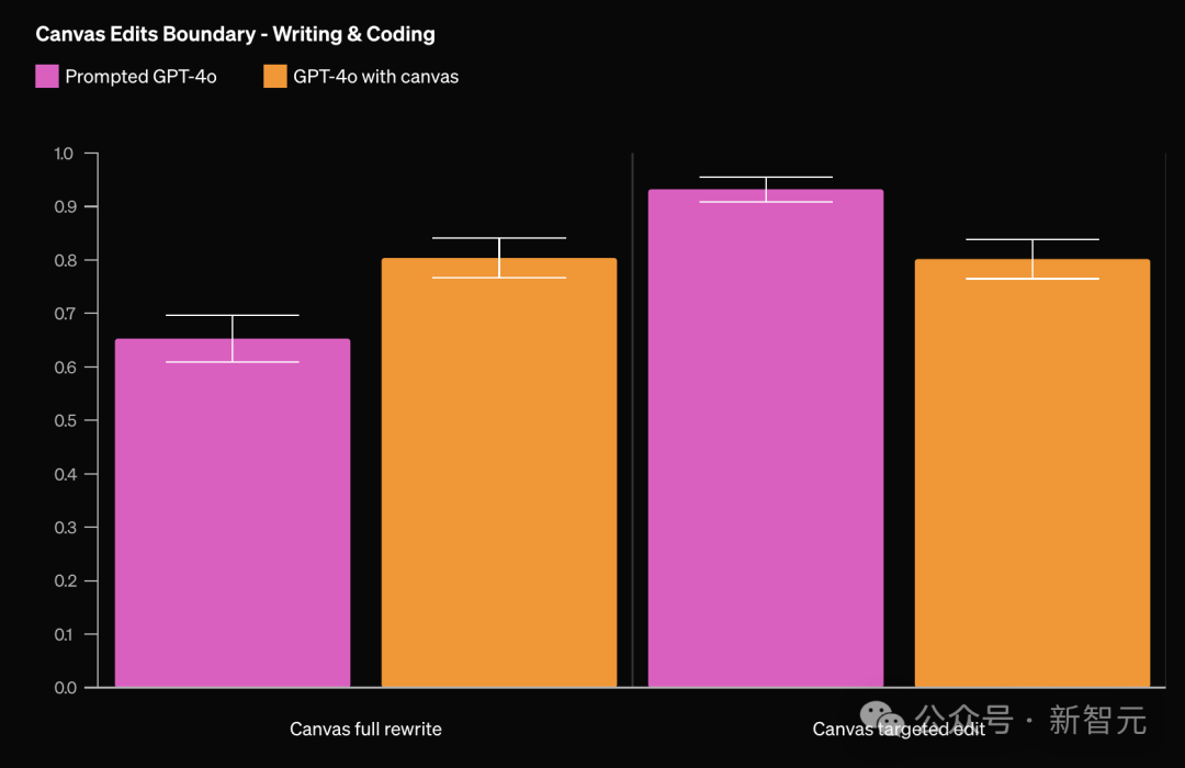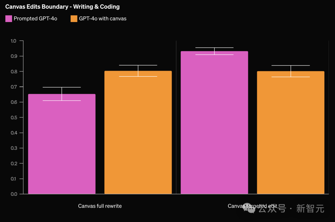 相比基线模型,带有canvas的GPT-4o在写作和编码任务上有18%的性能提升