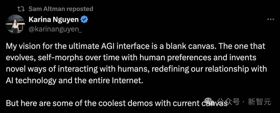 canvas项目负责人Karina Nguyen表示,我对终极AGI界面的愿景,是一张空白的画布。
