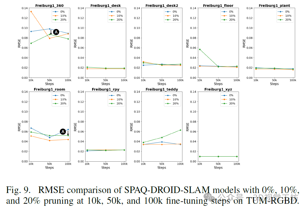 2)全面的评估显示,使用20%结构化剪枝和8位PTQ的SPAQ-DROID-SLAM减少了18.90%的浮点运算数(FLOPs)和79.8%的模型大小。在TUM-RGBD基准测试中,其绝对轨迹误差(ATE)指标比原始DROID-SLAM基线提高了10.5%,并在ETH3D SLAM基准测试中表现出更好的泛化能力,具有更高的AUC分数,并在另外两个序列中取得成功。