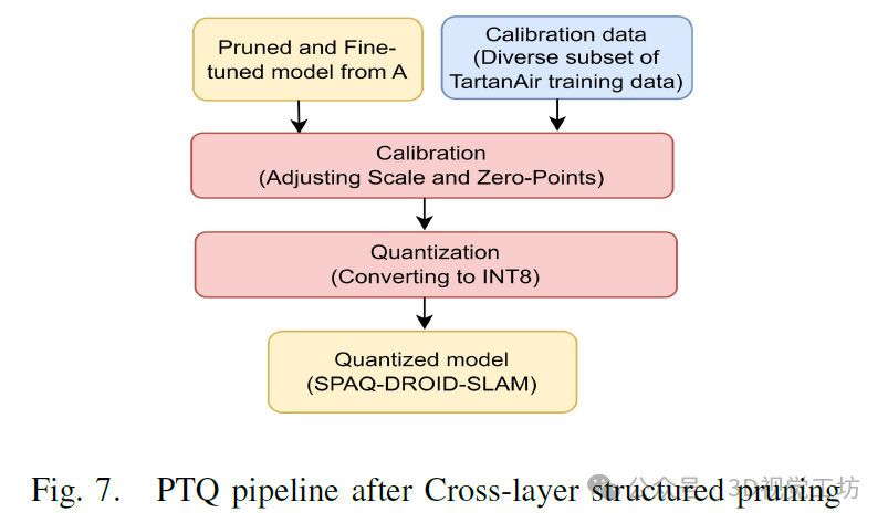 剪枝阶段之后,DROID-SLAM架构会经历训练后量化(PTQ),以将模型的32位浮点数转换为8位整数。