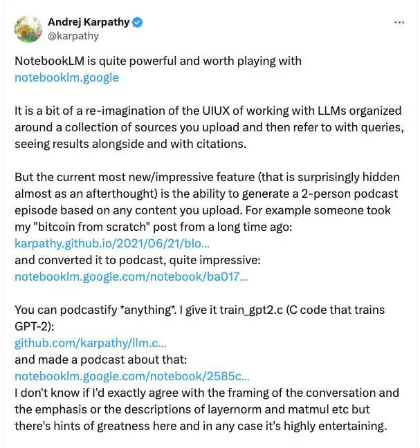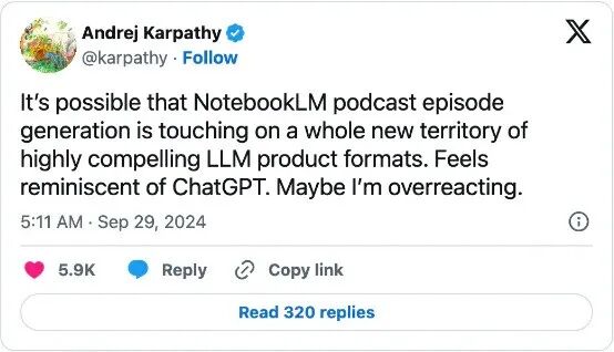NotebookLM 播客生成功能似乎触及了一个全新领域,也就是极具吸引力的大语言模型交付形式。这种感觉让人有种 ChatGPT 刚亮相时的惊艳,也许是我反应过度,但这真的令人印象深刻。