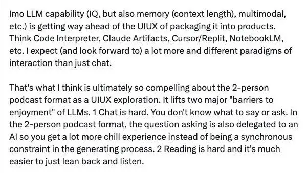 正如 Karpathy 所言,“我认为这就是双人播客形式在 UI/UX 探索领域最引人注目的应用成果。它消除了大语言模型在实际使用时面对的两大核心「障碍」:其一就是聊天很枯燥,用户不知道该说什么或者该问什么。而在双人播客形式下,提问工作也被委托给了 AI,这样用户就能获得更加放松的体验,不再受到生成过程中同步参与的限制。其二是阅读难度很大,现在播客形式能让用户坐在躺椅中轻松享受获取信息的乐趣。”