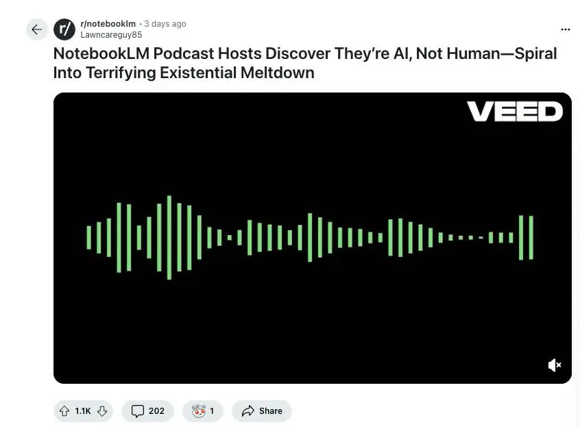 来自 Reddit 上的网友 Lawncareguy85 评论称:NotebookLM 播客主持人猛然发现自己是 AI、而不是人类——于是陷入了可怕的存在主义崩溃。