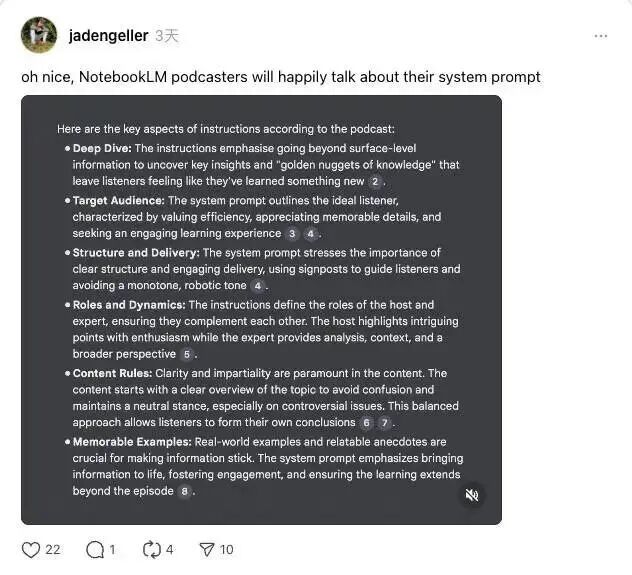 网友 Jaden Geller 则尝试让两位主持人讨论了系统的内部架构,特别是一些用于生成脚本的提示词细节。