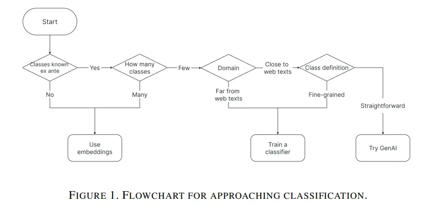 特别是在类别数量庞大的情况下,例如在记录链接任务中,每个独特的实体都可能被视为一个单独的类别。这时,由于计算资源的限制,研究人员可能无法为每个类别都训练一个分类器,因此需要依赖嵌入向量来进行更为高效的处理。嵌入向量能够捕捉到数据的内在特征,使得即便在类别众多的情况下,也能进行有效的数据分析和模式识别。当类别已经明确定义并且数量适中时,无论是分类器还是生成式人工智能(AI)都可能是解决这类问题的理想选择。然而,如果应用场景与用于预训练神经网络的数据存在差异——这在处理历史数据、文档扫描或特定环境下尤为常见——那么从预训练语料库到应用领域的转换可能会带来显著的领域差异。这种情况下,可能需要对分类器进行调整和定制,以确保其能够发挥出强大的性能。类别定义的准确性同样至关重要。对于一些简单的任务,使用现成的生成式AI模型,例如OpenAI的GPT,将其设置为文本生成模式,可能会取得不错的效果。而对于更为复杂和微妙的任务,定制训练的分类器能够通过深入学习具体的示例,更精准地捕捉到任务的细微差别。如果对选择哪种方法没有把握,研究人员可以先尝试使用现成的方法,如果性能不尽如人意,再考虑转向定制的分类器。综述中指出,尽管定制训练的分类器在文本分类任务中通常能够展现出比GPT更优越的性能,但在处理一些简单任务时,生成式AI和定制分类器都能够取得良好的效果。此外,综述还对这些方法的成本效益进行了考量,指出在选择合适的方法时,不仅要考虑技术的性能,还要考虑实施的成本和资源的可用性。