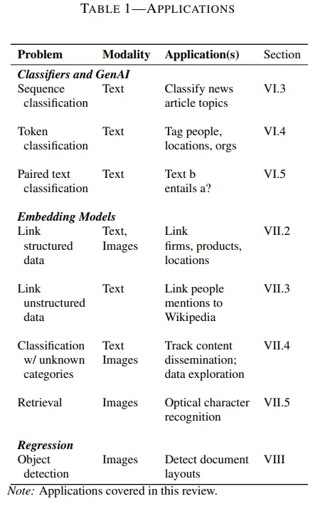 文章中涵盖了多种应用场景,包括但不限于分类、命名实体识别、记录链接、实体消歧、追踪媒体内容的复制、评估大规模文本语料库中的程式化事实、光学字符识别(OCR)以及文档布局分析(classification, named entity recognition, record linkage, entity disambiguation, tracing reproduced content through media, assessing stylized facts in massive-scale text corpora, optical character recognition, and document layout analysis)。