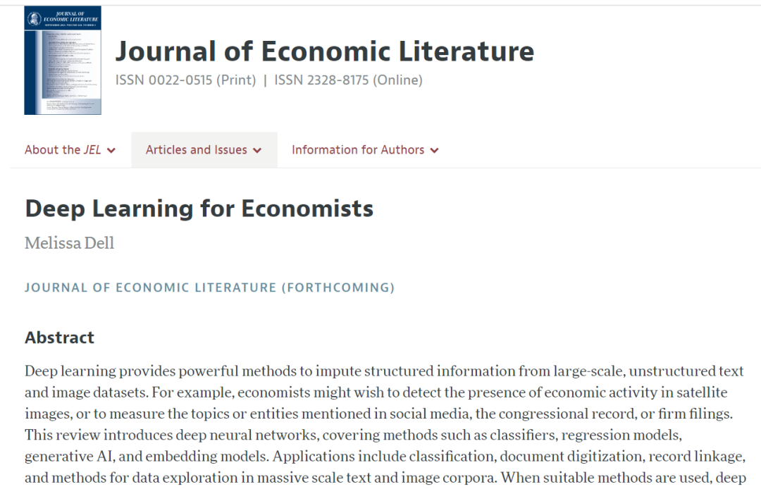 2024年诺贝尔物理学奖授予了John Hopfield和Geoffrey Hinton,以表彰他们在通过人工神经网络实现机器学习的基础性发现和发明方面的杰出贡献。这对经济学家来说同样具有重要意义,因为机器学习技术正日益融入经济学等学科的研究之中。那么,经济学家如何应用人工神经网络和机器学习技术呢?哈佛大学的Melissa Dell教授,以极快的速度在AEA的Journal of Economic Literature上发表了一篇经济学和商学学者必读的综述性文章:“Deep learning for economists”。
