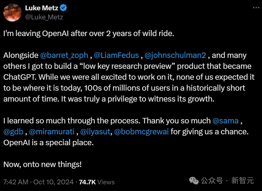 Luke Metz曾与Zoph和Fedus在谷歌AI研究组是同僚,如今在OpenAI任职两年后,也将离开这家公司。据称,Zoph、Fedus和Metz都是ChatGPT的主要贡献者,并在公司担任过各种后训练角色。目前,Zoph计划创办一家新公司,但尚不清楚Metz或Murati是否会加盟。在他官宣推文中,称自己是最初团队成员之一,并与联创John Schulman、后训练VP Barret Zoph、Liam Fedus以及其他许多同事一起,参与了一个「早期研究预览」产品的开发。它最终演变成了如今的ChatGPT。