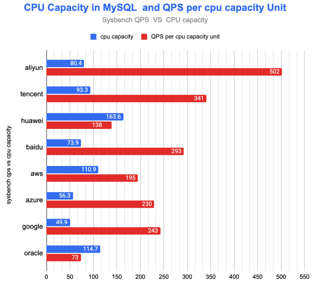 “单位 CPU 上的 Sysbench QPS”(Sysbench QPS per CPU Capacity Unit),很大程度上展现了各个厂商在该测试模型下,对 MySQL 内核性能优化的效果如何。