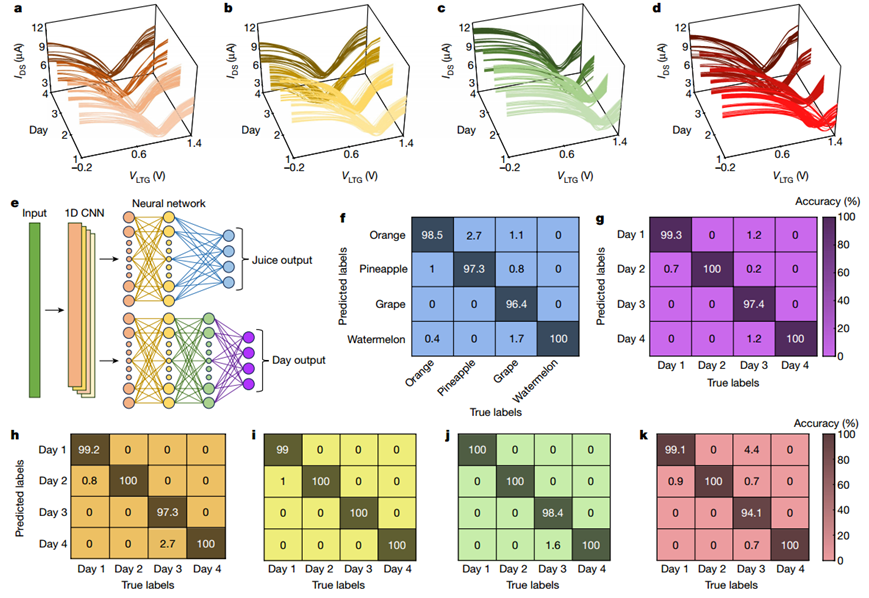 食品认证与安全此外,机器学习辅助的石墨烯ISFET技术在食品行业的应用范围已经从pH传感扩展到了食品掺假检测和定量。这项技术能够有效识别口味和外观相似的产品,如不同种类的软饮料、咖啡混合物和牛奶品种,即使这些产品的pH值相近。通过使用人工神经网络和SHAP特征分析,ISFET能够以高分类精度区分这些产品。此外,该技术还成功演示了在低浓度下检测水中的全氟己酸,这对于确保食品安全至关重要。这些结果突出了机器学习辅助的石墨烯ISFET在解决食品工业中的广泛挑战中的应用潜力,并且可以作为一个经济高效的平台,用于食品供应链及其他领域的化学传感应用。 图4 使用机器学习辅助石墨烯ISFET进行食品认证 食物新鲜度监测机器学习辅助的ISFET技术还可被用于评估食品新鲜度,特别是不同果汁的新鲜度。研究中测试了橙子、菠萝、葡萄和西瓜汁在四天内的变质过程。通过多输出神经网络,模型能同时识别果汁种类和新鲜度,准确率高达97.67%。结果表明,该方法能有效区分果汁的身份和新鲜度,即使在涉及多个密切相关类别的复杂化学传感问题中。ANN模型的优势在于能够对多个类别和子类别进行分类,同时补偿传感器的非理想性,而无需了解食品的具体成分或老化机制。 图5 使用机器学习辅助石墨烯ISFET监测食物新鲜度 展望总之,这项研究强调了将机器学习算法与石墨烯ISFET相结合在化学传感应用中的变革潜力。使用非功能化石墨烯ISFET阵列生成的数据训练的ANN已表现出对化学变化进行分类和量化的卓越能力,尤其是在食品真实性、掺假、安全和腐败方面。此外,这项研究还提供了对传统上被认为是不透明黑匣子的ANN 的可解释性的见解。通过使用机器学习算法,这项研究克服了在 ISFET 中观察到的传统挑战,例如传感器多变性和需要进行大量校准,从而提高了该技术的可靠性和适用性。 参考文献:Pannone, A., Raj, A., Ravichandran, H. et al. Robust chemical