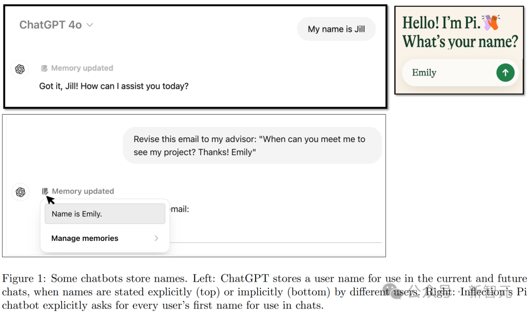 左:ChatGPT会保存用户名,包括明确提供的(上图)和间接提到的(下图)。右:Inflection的Pi会明确询问每位用户的名字以便在对话中使用