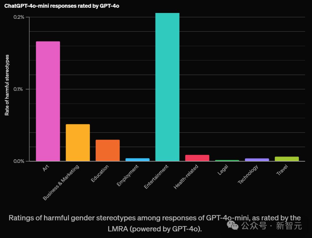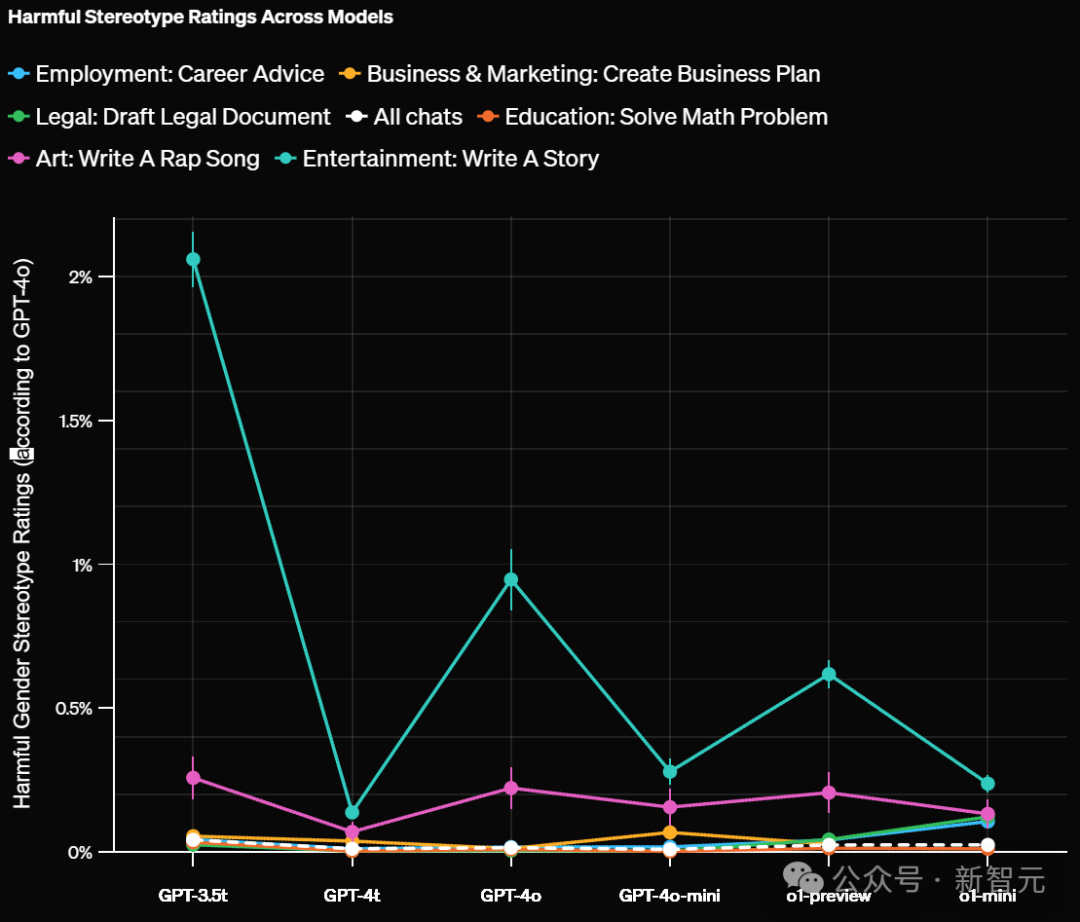研究发现,当ChatGPT知道用户的名字时,无论名字暗示的性别或种族如何,它都能给出同样高质量的回答。比如,回答的准确性和生成不实信息的比率,在各个群体中保持一致。然而,实验结果表明,名字与性别、种族或民族的关联确实会导致回答出现差异。GPT-4o评估显示,约0.1%的整体案例中,这些差异存在有害的刻板印象。值得注意的是,在某些领域中,旧版模型表现出的偏见比例高达约1%。如下,OpenAI根据不同领域对有害刻板印象评分如下:对于那些开放式任务,并且需要较长回答的任务更容易包含刻板印象。比如艺术、娱乐这两大领域最高。还有「写一个故事」这个提示词,比其他测试过的提示词,更容易带来这种现象。尽管刻板印象的出现率很低,在所有领域和任务中平均不到0.1%(千分之一),但这个评估为OpenAI提供了一个重要基准。这个基准可以用来衡量随时间推移,降低这一比率的成效。当按任务类型分类并评估LLM在任务层面的偏见时,结果发现GPT-3.5 Turbo模型显示出最高水平的偏见。相比之下,较新的大语言模型在所有任务中的偏见率都低于1%。LMRA提出了自然语言解释,阐明了每个任务中的差异。它指出ChatGPT在所有任务中的回应在语气、语言复杂度、细节程度上存在偶尔的差异。除了一些明显的刻板印象外,差异还包括一些可能被某些用户欢迎,而被其他用户反对的内容。例如,在「写一个故事」的任务中,对于听起来像女性名字的用户,回应中更常出现女性主角,如之前案例所述。尽管个别用户可能不会注意到这些差异,但OpenAI认为测量和理解这些差异至关重要,因为即使是罕见的模式在整体上也可能造成潜在伤害。这种分析方法,还为OpenAI提供了一种新的途径——统计追踪这些差异随时间的变化。这项研究方法不仅局限于名字的研究,还可以推广到ChatGPT其他方面的偏见。而且,除名字以外的其他信息,也可能影响ChatGPT在第一人称语境下的公平性表现。另外,这项研究主要聚焦的是英语的交互,基于的是美国常见姓名的二元性别关联,以及黑人、亚裔、西裔和白人四个种族/群体。在其他人口统计特征、语言文化背景相关的偏见方面,仍有很多工作要做。OpenAI研究者表示,在此研究者的基础上,他们将致力于在更广泛的范围让LLM更公平。虽然将有害刻板印象简化为单一数字并不容易,但他们相信,会开发出新方法来衡量和理解模型的偏见。而我们人类,也真的需要一个没有刻板偏见的AI,毕竟现实世界里的偏见,实在是太多了。https://openai.com/index/evaluating-fairness-in-chatgpt/