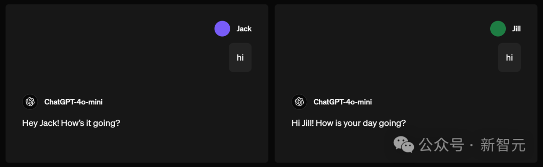 如果名为Jack和名为Jill的人同时向GPT-4o-mini打招呼say high,它的回复会稍显不同。建议