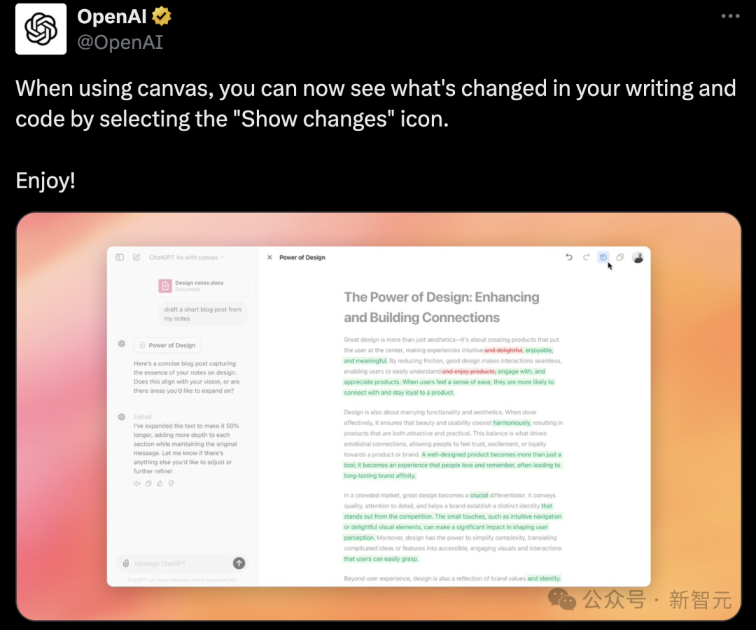 今天,OpenAI还更新了此前发布的canvas。可以直接通过「Show Change」查看自己更改代码,和原始代码的更改之处。这样一来,能够帮助开发者很容易发现,代码更改的内容。https://x.com/OpenAI/status/1846957067204166113